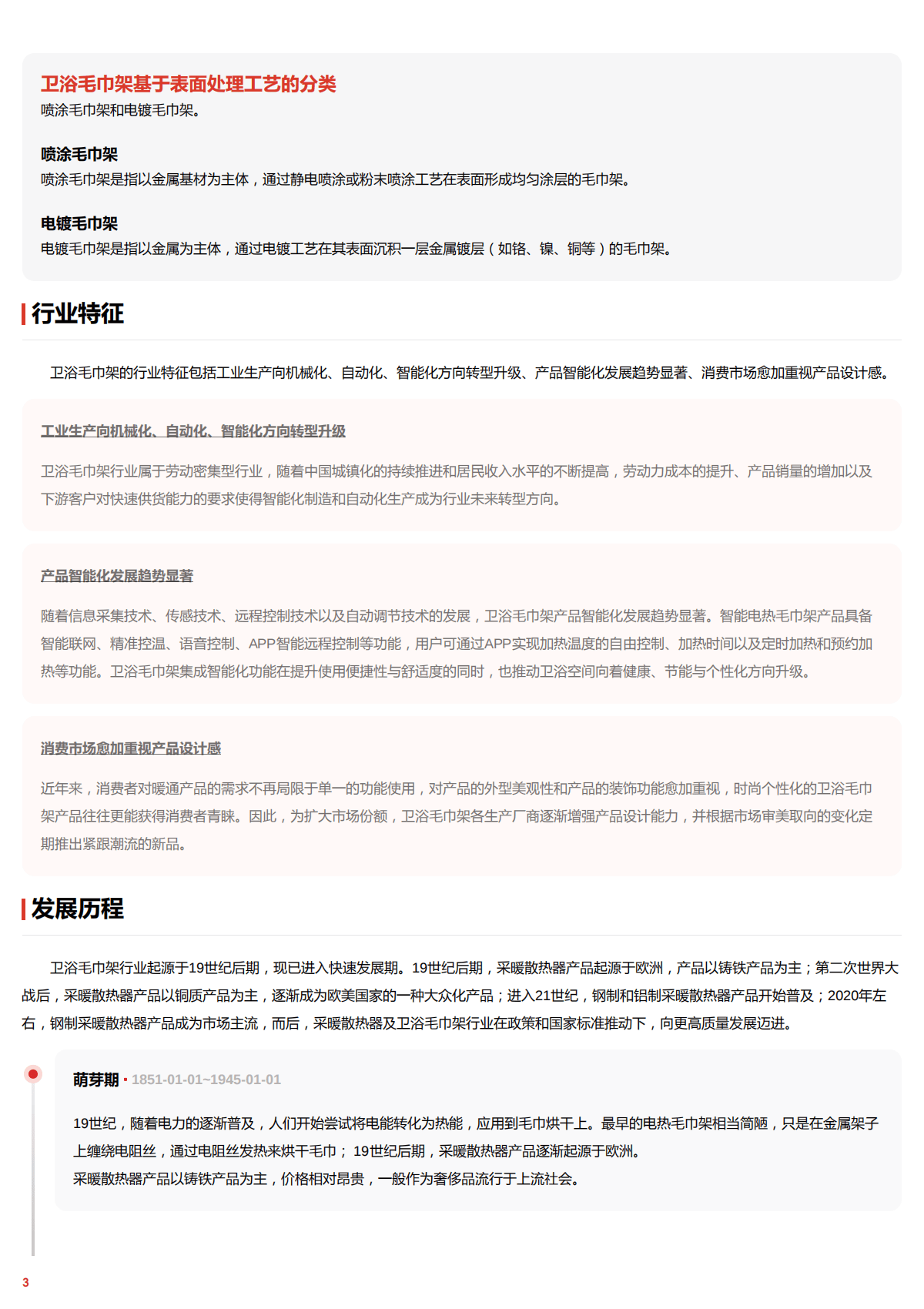 卫浴毛巾架作为暖通家居产品,主要分为水暖型与电热型两类,其核心功能是通过加热烘干毛巾、浴巾等,避免潮湿环境滋生细菌。当前行业整体向机械化、自动化与智能化方向转型,智能联网、语音控制、APP远程操控等功能逐渐成为中高端产品的标配。与此同时,消费者对产品设计美学与家居风格融合的关注度不断提升,推动企业不断强化设计能力与新品开发节奏。