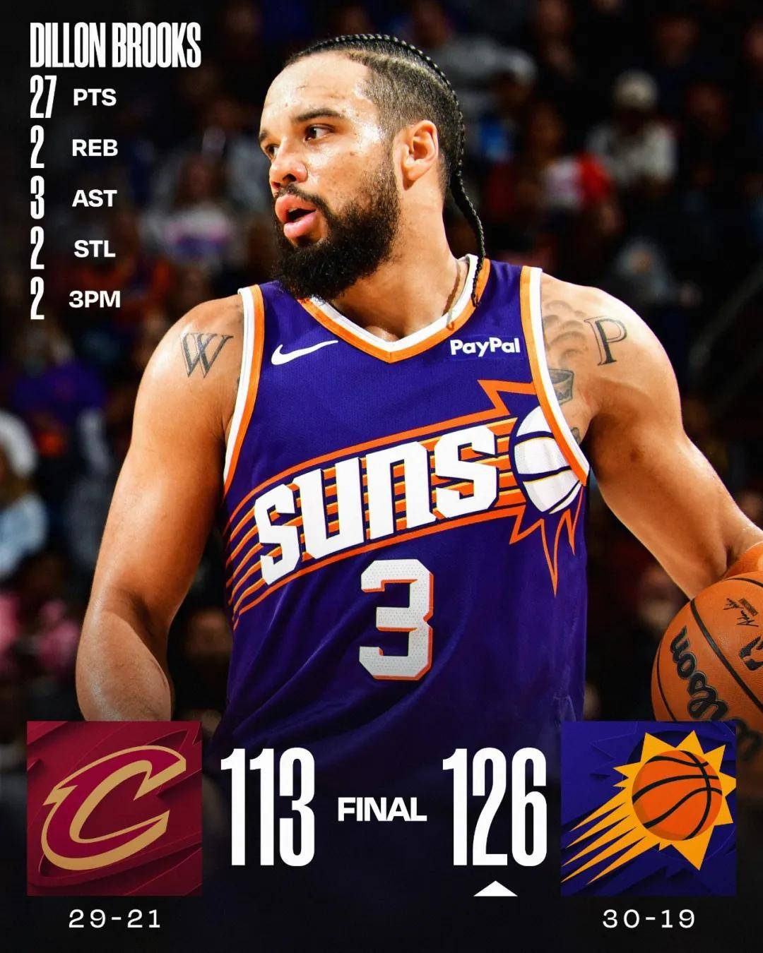 北京时间1月31日,NBA常规赛:太阳背靠背126-113轻取骑士。上一场轰下40分的狄龙,延续了火热手感:14投9中,三分4中2,罚球8中7,砍下27分2篮板3助攻2抢断,正负值+24!狄龙得分又是全场最高,正负值全场第二高。