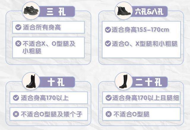 看似简单的马丁靴,其实它也分很多种,光是“孔数”上,马丁靴就有分很多种,有分3孔、6孔、8孔、10孔、20孔等,这么多孔数的区分,也是针对了不同身高的人群,挑选的时候,需要结合自己的身高来选择,不能盲目瞎选。