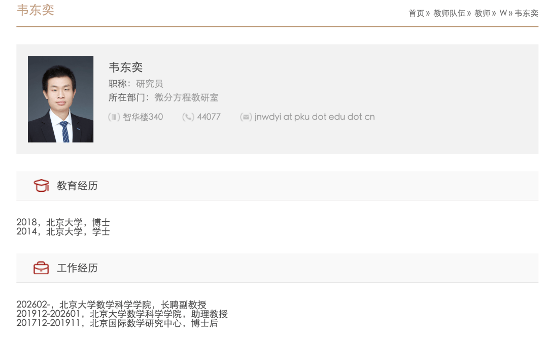 据北京大学数学科学学院网站信息显示, 自2026年2月起,学院助理教授韦东奕获聘北京大学长聘副教授。