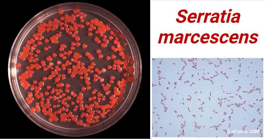 粘质沙雷氏菌(Serratia marcescens)也称为灵杆菌,是自然界中最小的细菌,因其能产生一种名叫灵菌红素的脂溶性红色色素,所以菌落是漂亮的淡红色或粉色。