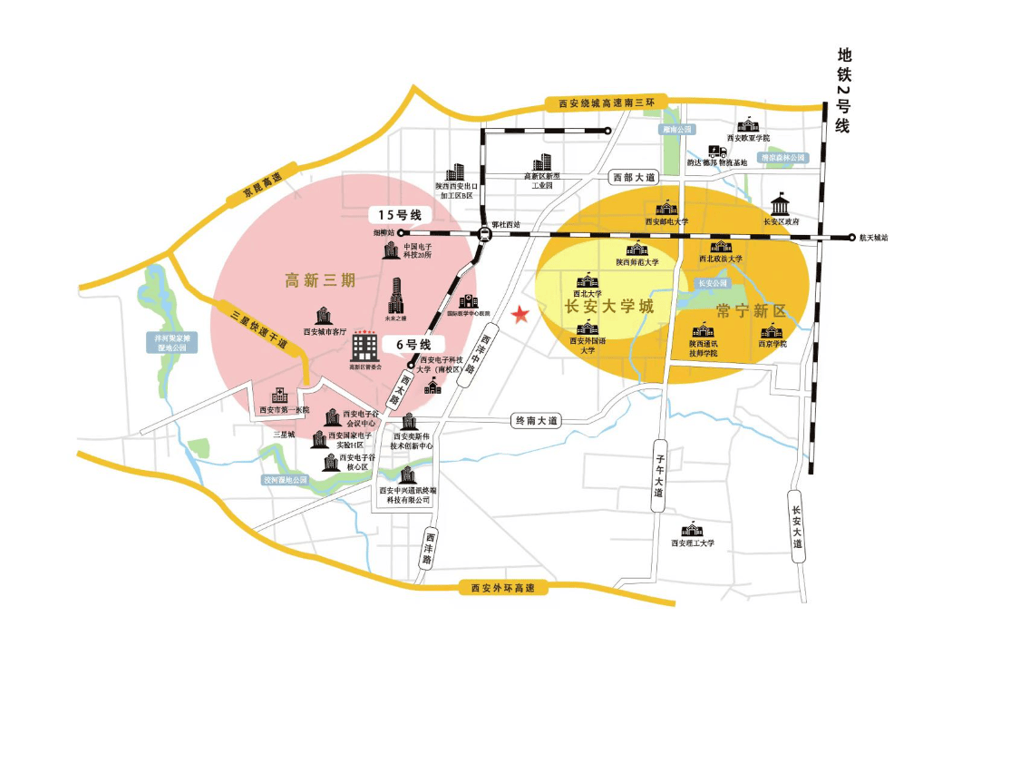 项目周边交通便捷,包括西沣路、香积大街等主干道、西安南站、6号线和15号线地铁站;未来距项目100米内还设有地铁7号线站点即香积大街站
