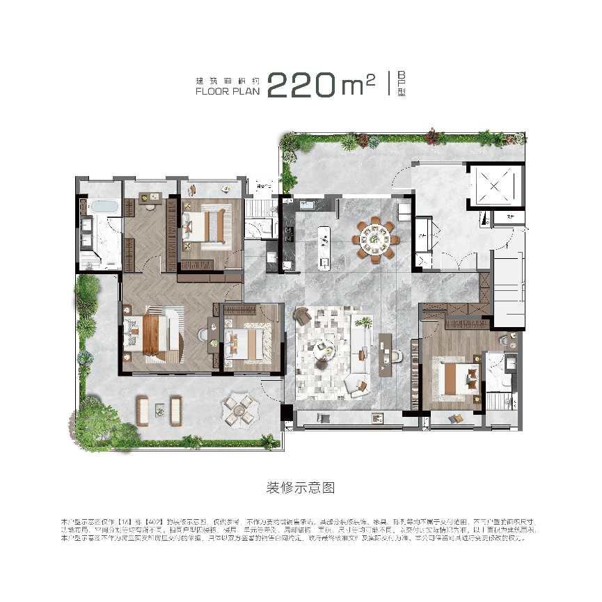 产品规划:建面约150㎡、185㎡、220㎡,户均约30-50㎡空中庭院