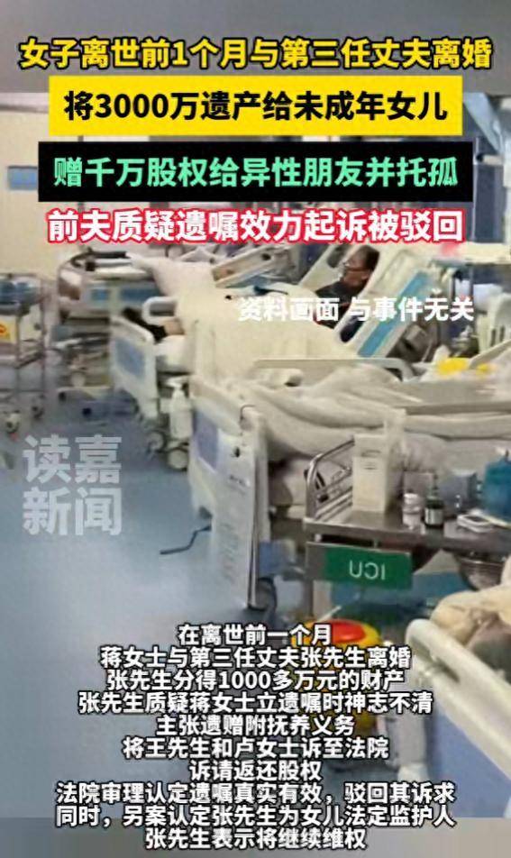 去世前一个月,蒋女士与第三任丈夫张先生离婚,协议约定女儿由蒋女士抚养,张先生无需支付抚养费。张先生称离婚时分得一千余万元财产,蒋女士去世后又获得三套深圳房产及15万元现金。