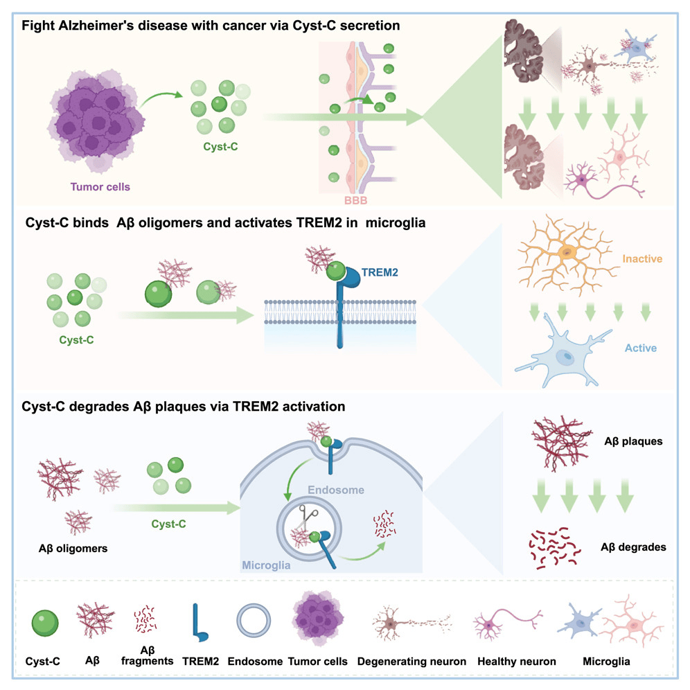进入大脑后,胱抑素C会结合在致病性的β-淀粉样蛋白寡聚体和斑块上,随后整体与小胶质细胞(大脑中的免疫细胞)上的关键受体 TREM2 结合,将小胶质细胞激活。