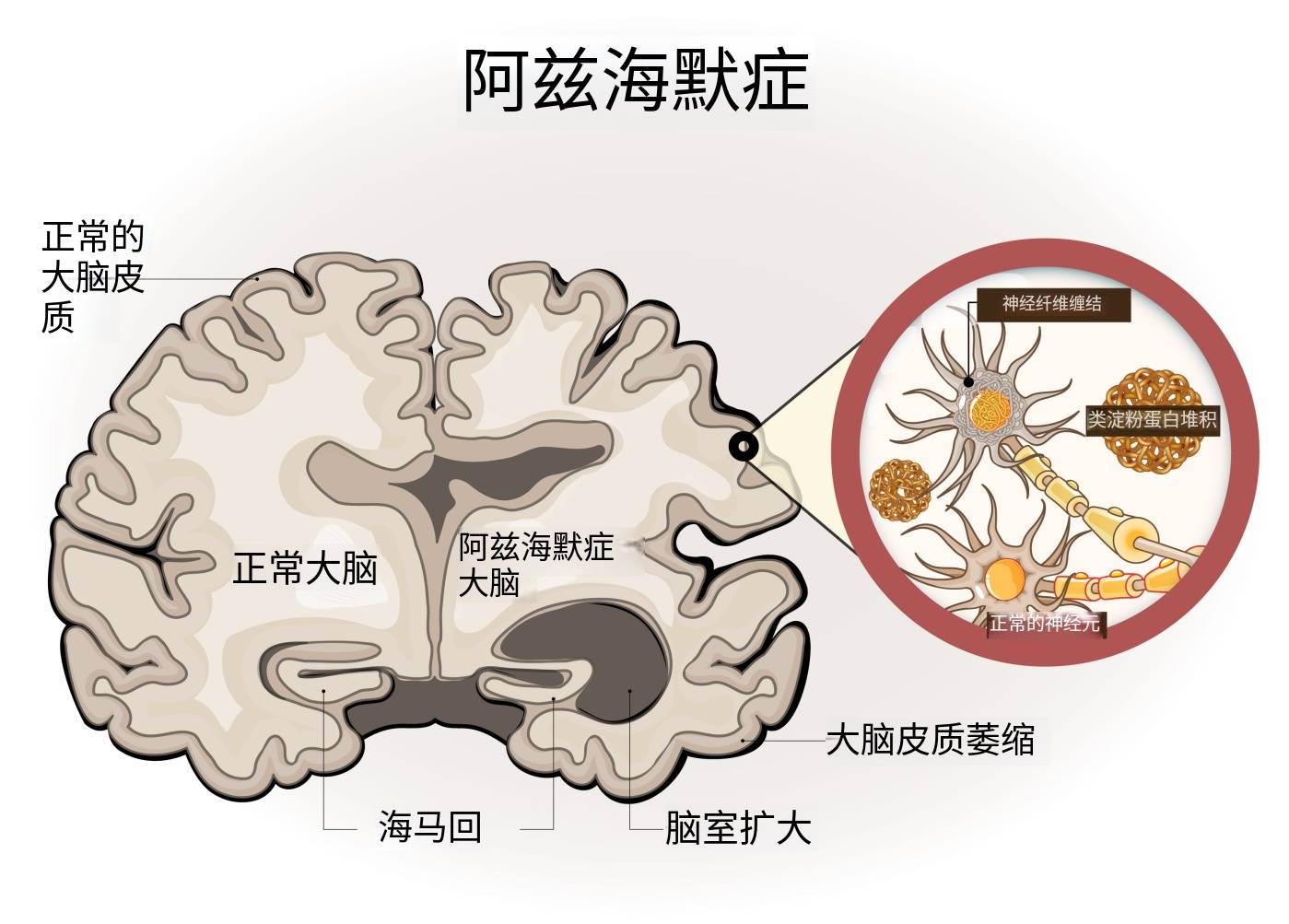 阿尔茨海默病的核心病理标志是,一种名为β-淀粉样蛋白的黏性沉积物在脑神经细胞间积聚。所形成的β-淀粉样蛋白斑块会干扰神经细胞之间的信号传递,并引发炎症和损伤,从而逐渐侵蚀患者的记忆和思维能力。