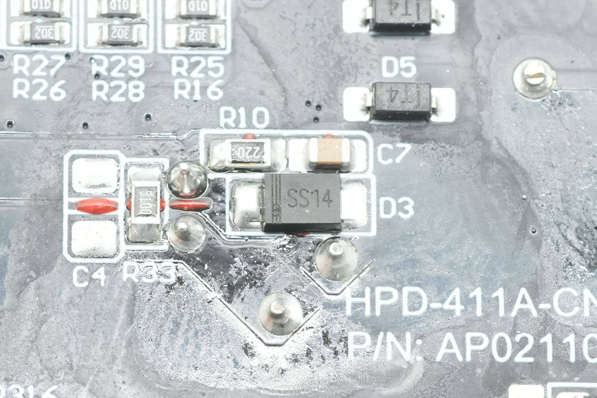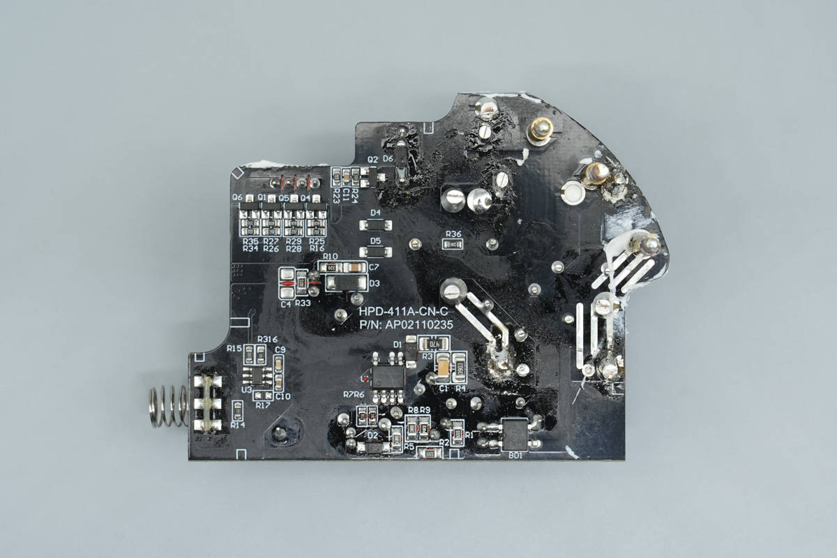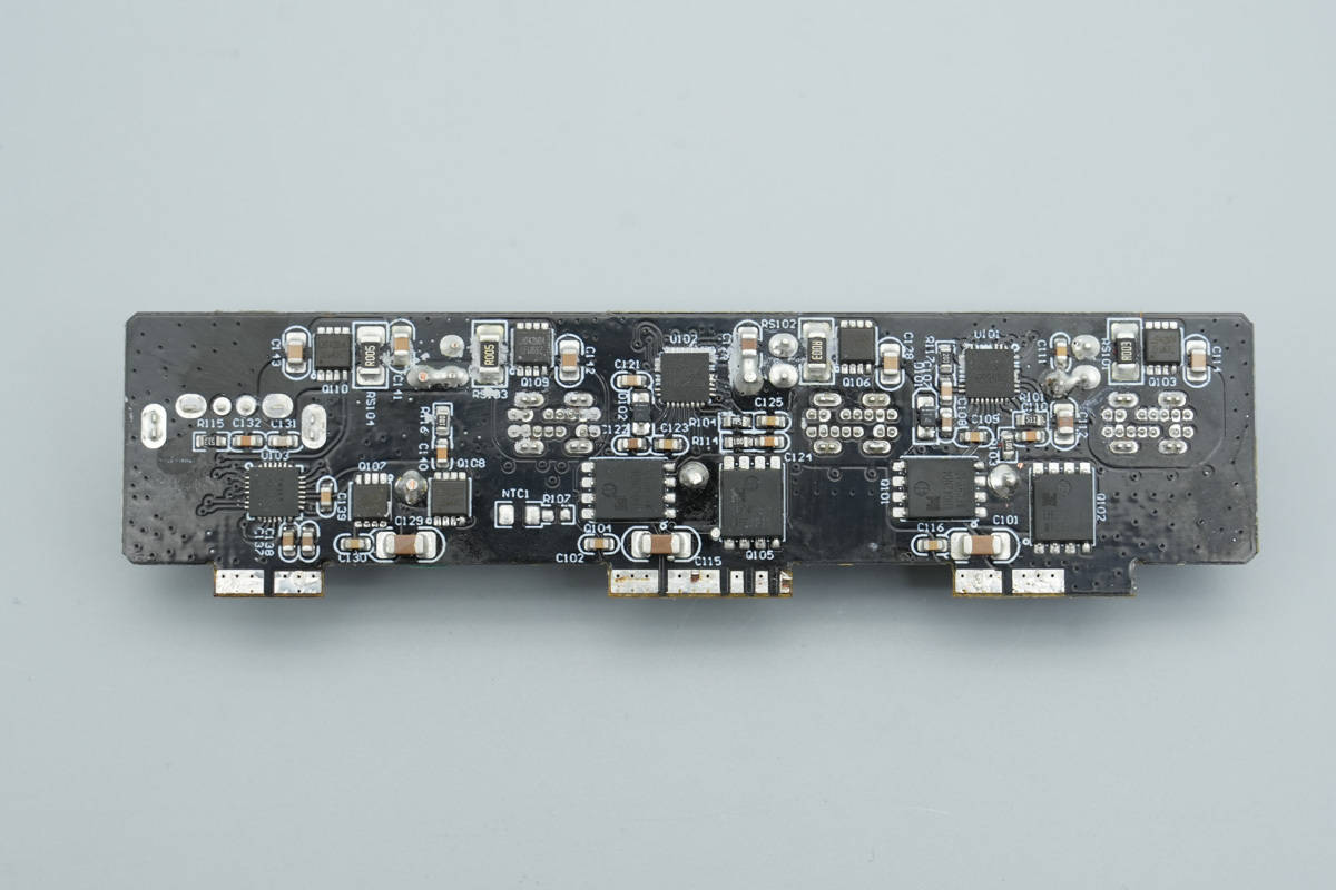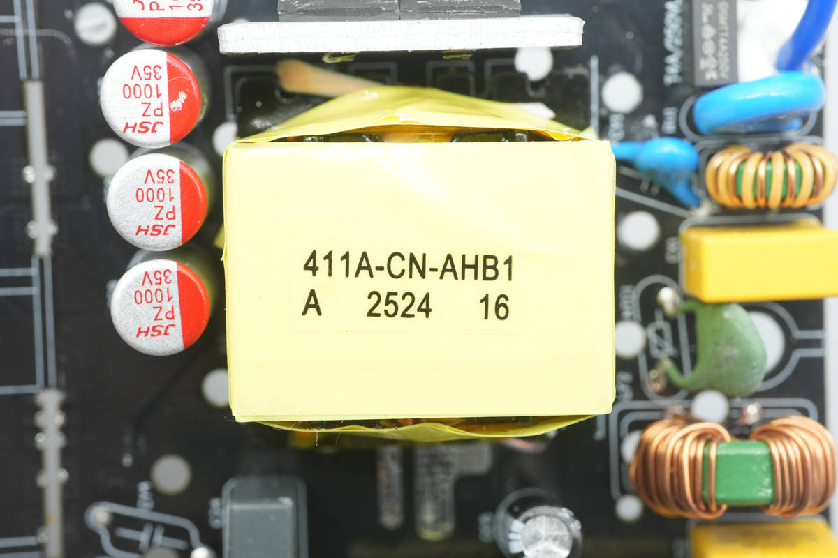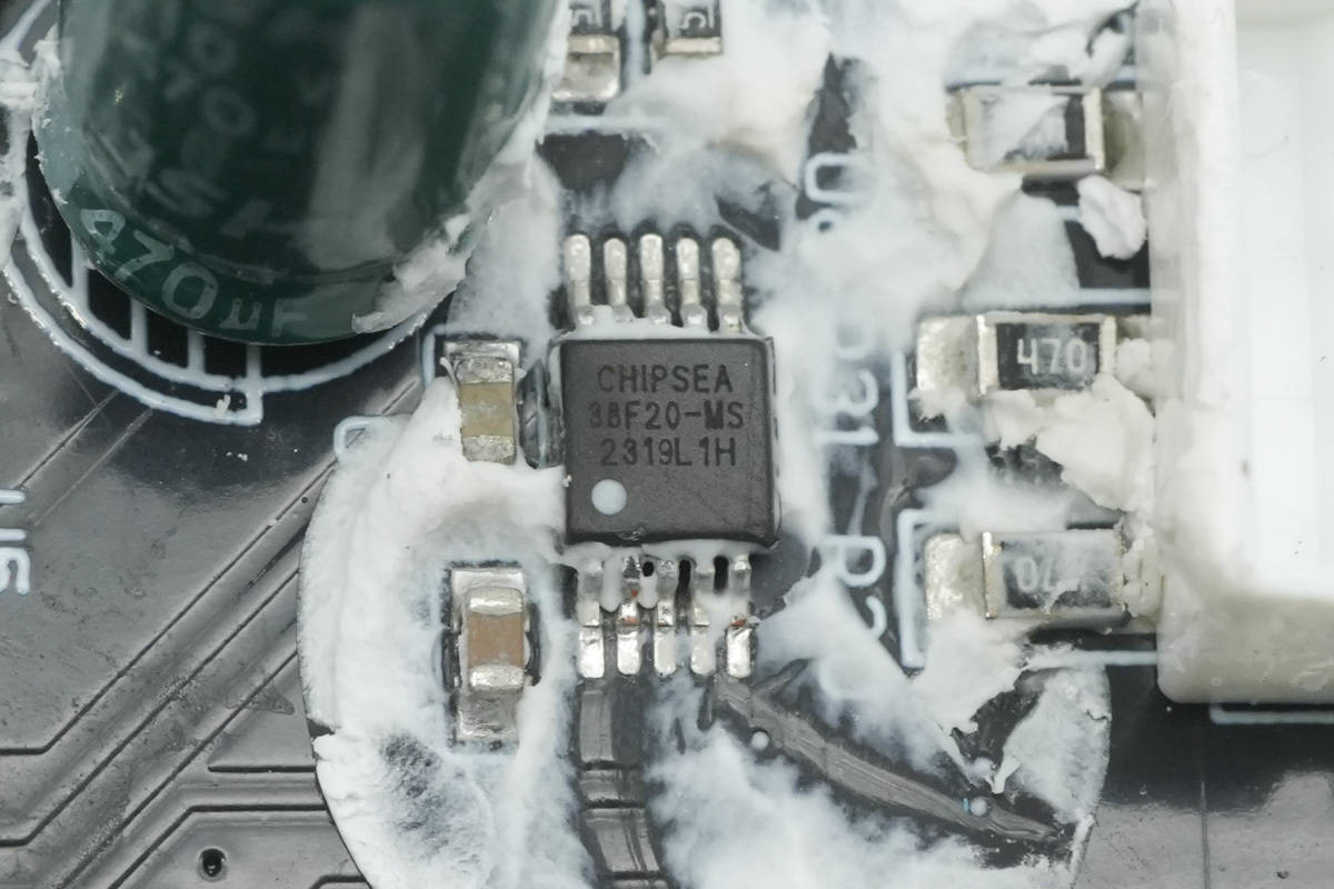 背面对应PFC开关管,PFC整流管和AHB半桥芯片均涂有导热胶加强散热。