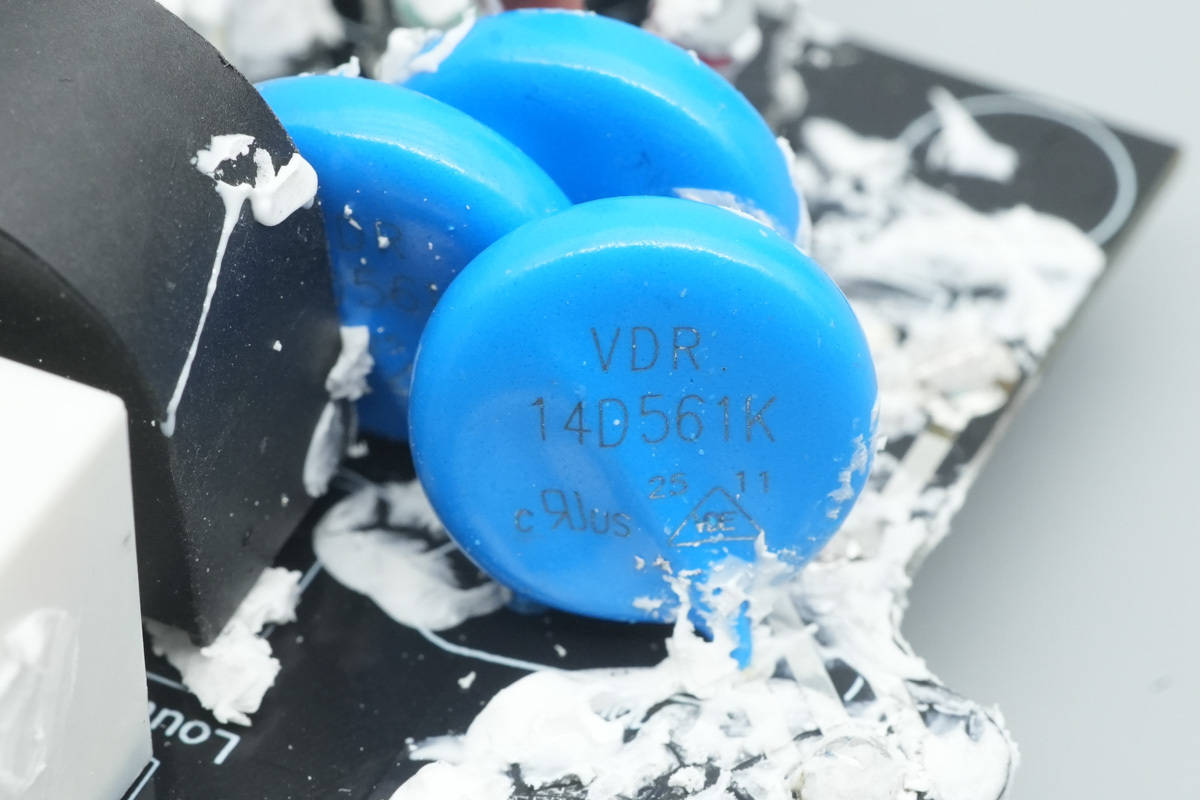 三颗蓝色压敏电阻型号相同,来自嵩隆,型号VDR14D561K,用于吸收过压浪涌。