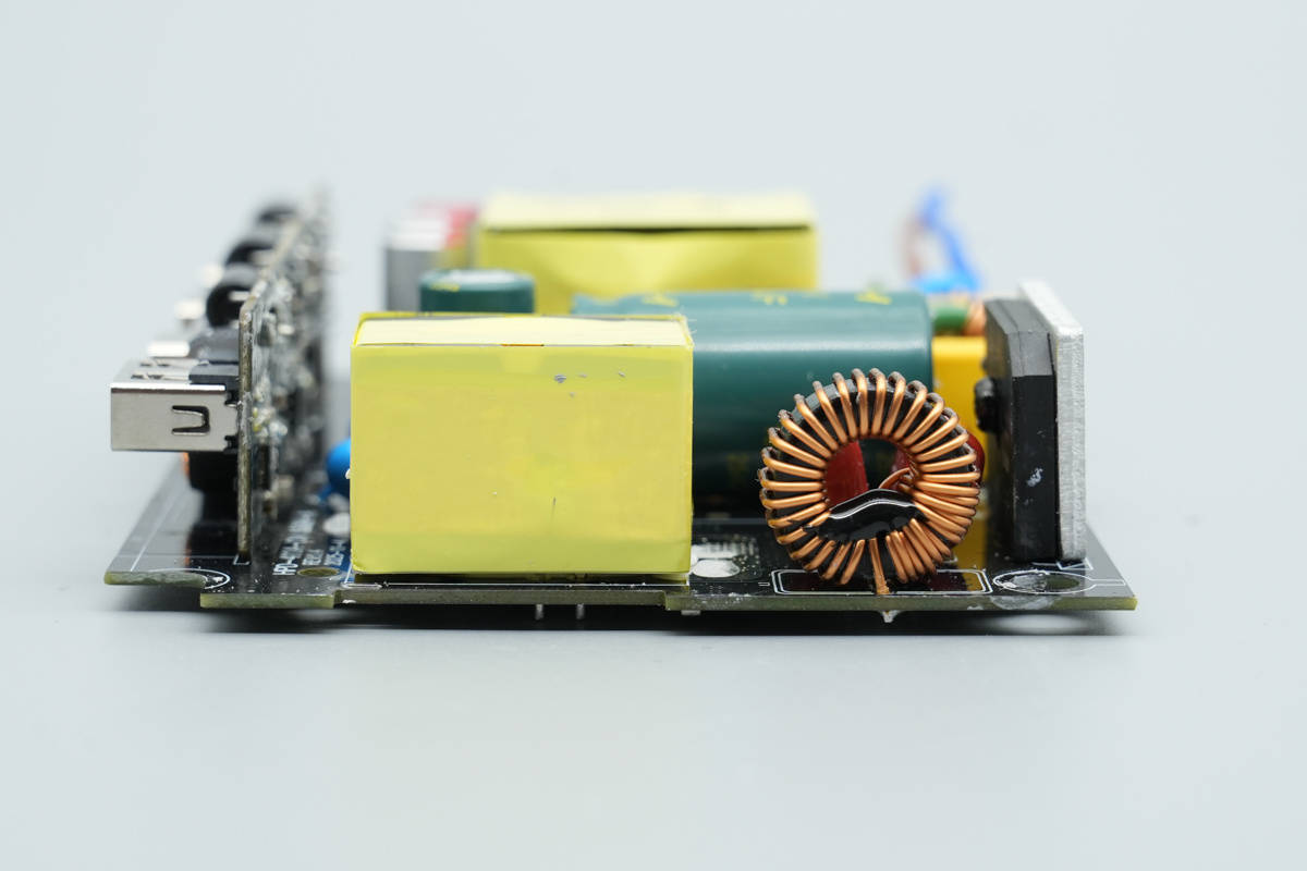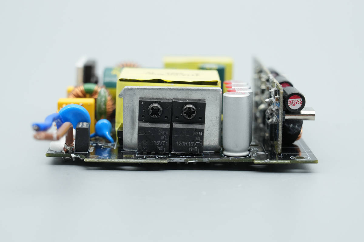 中间右侧位置设有变压器和同步整流管,右侧上方设有滤波电容。顶部为降压小板,设有滤波电容和降压电感。