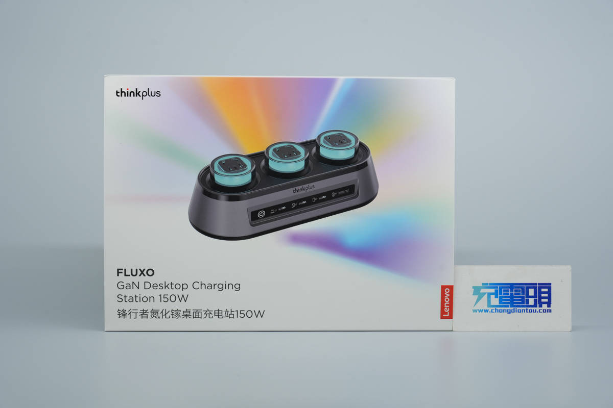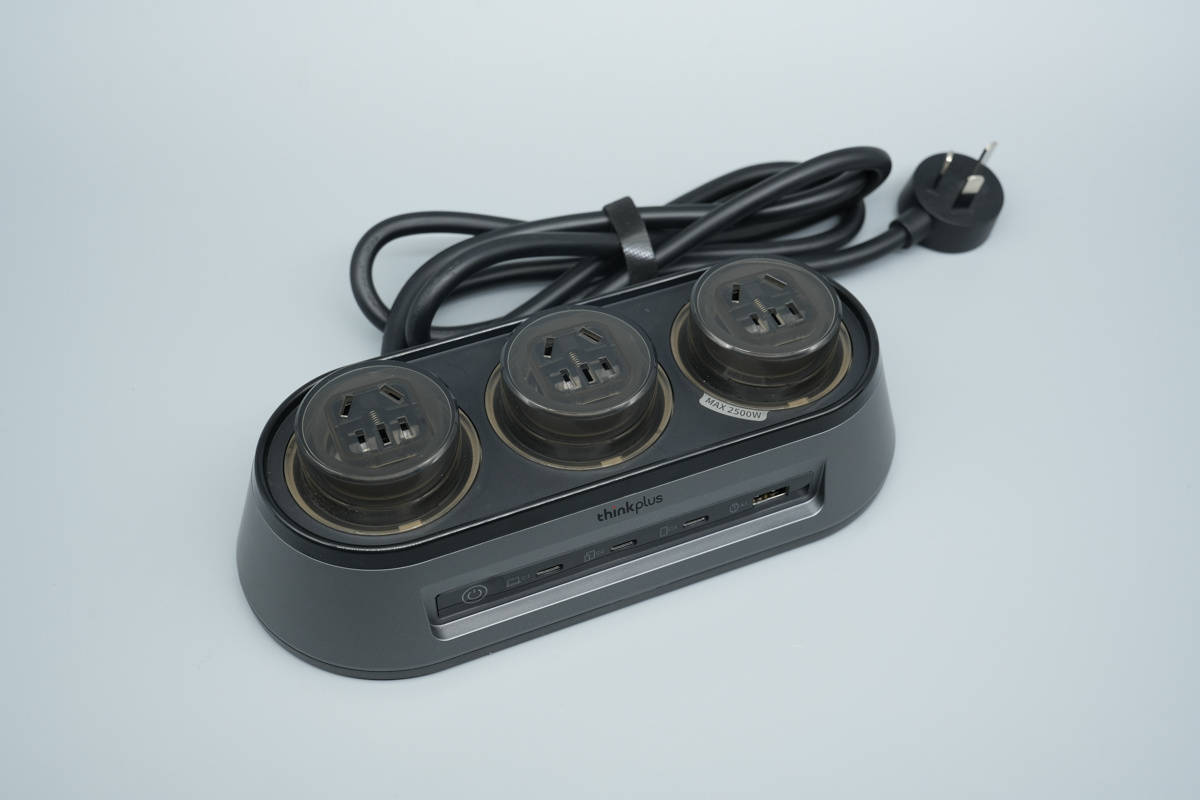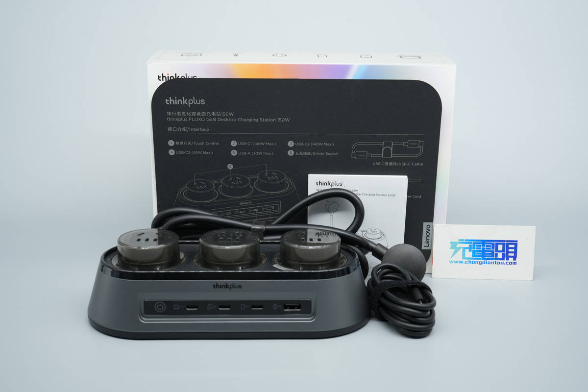 thinkplus锋行者氮化镓桌面充电站一览,自带三脚插头电源线。