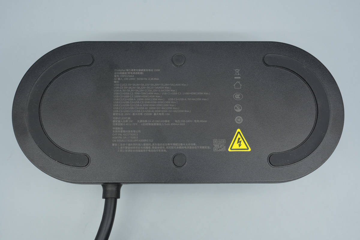 桌面充电站AC插座内部自带国标安全门,具备过流保护和防雷保护功能,还设有炫彩LED,通过触摸按键控制灯光。下面充电头网就带来thinkplus锋行者氮化镓桌面充电站的拆解,一起看看内部的设计和用料。