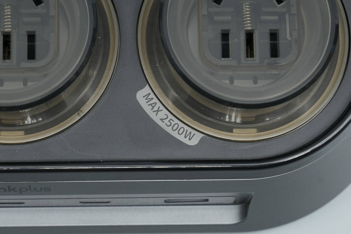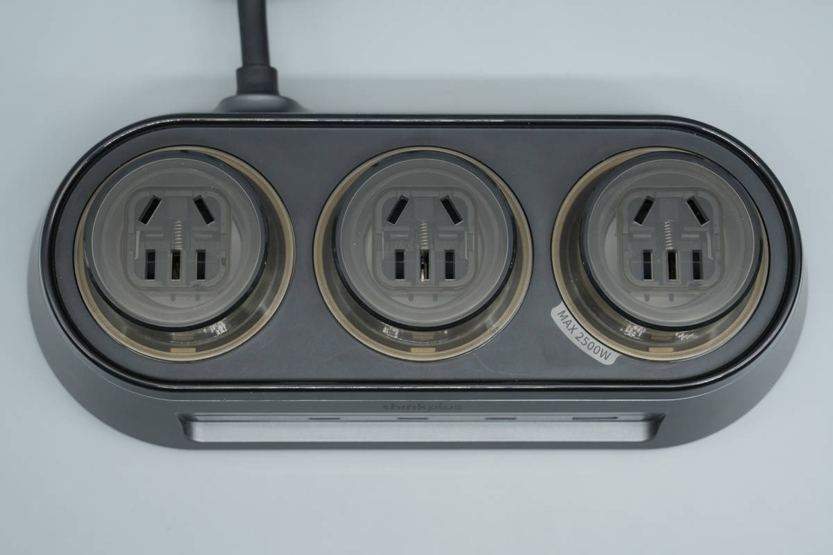 thinkplus锋行者氮化镓桌面充电站具备3个AC插座,3个USB-C接口和USB-A接口,USB-C接口支持140W输出功率,总输出功率为150W,支持自动功率分配。充电站AC插座设有国标安全门,具备防雷保护功能,还设有炫彩LED,灯光效果通过触摸按键。