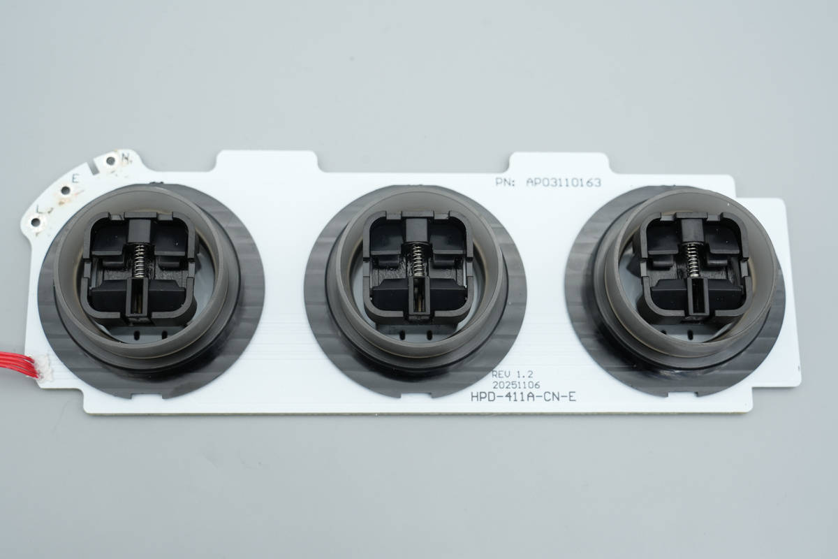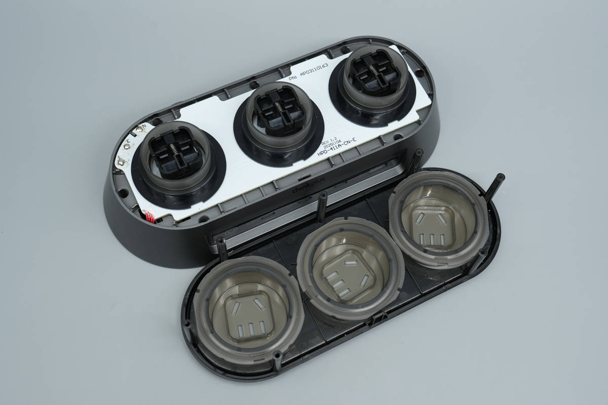 顶部三个插座通过PCB连接,盖子内部设有半透明绝缘盖。