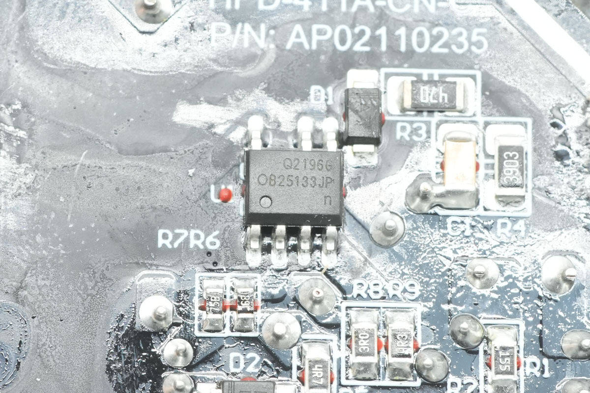电源芯片来自昂宝,型号OB25133,是一颗高精度恒压恒流的初级侧电源开关,芯片内部集成多模式控制器,无需431电压基准和光耦反馈,拥有良好的动态响应,具备完善的保护功能,采用SOP7封装。