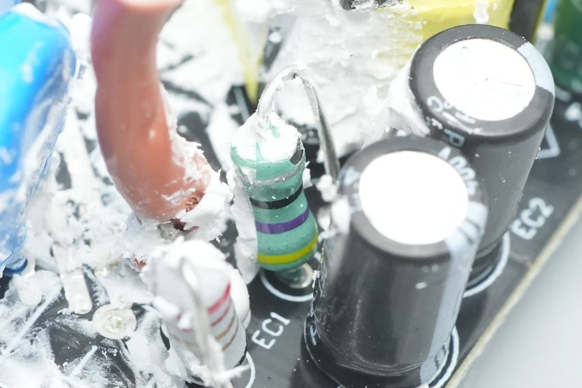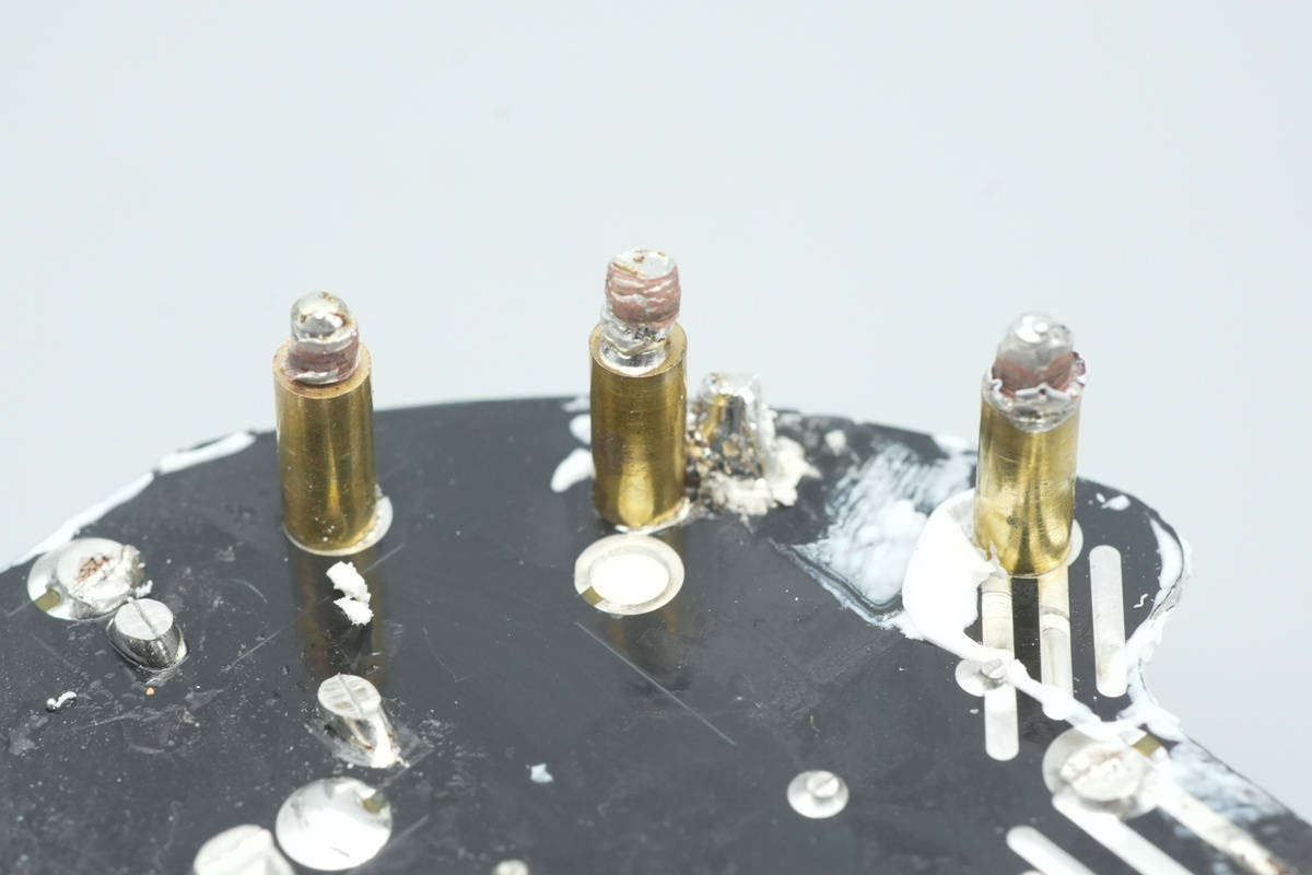 PCB背面连接供电的铜柱特写。