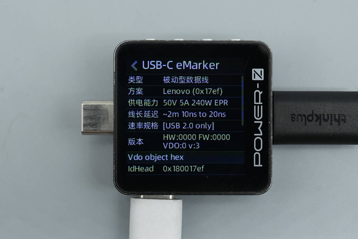 使用ChargerLAB POWER-Z KM003C测得充电线带有E-Marker芯片,电力传输能力为50V5A。