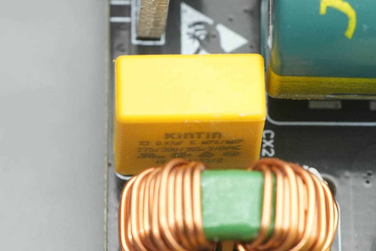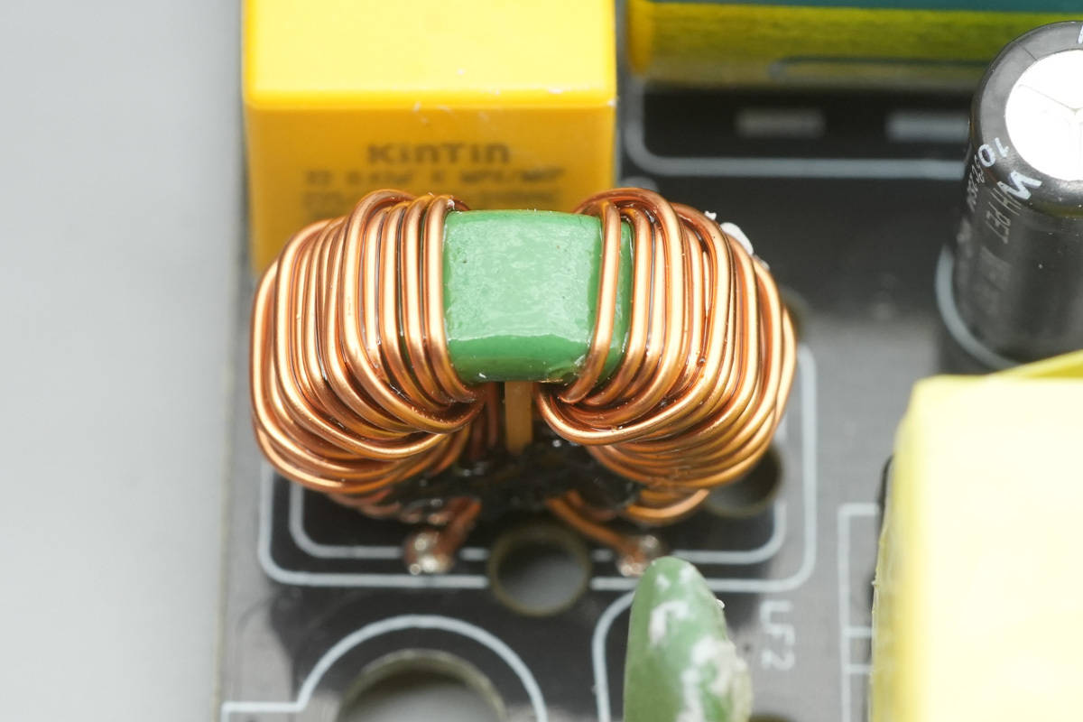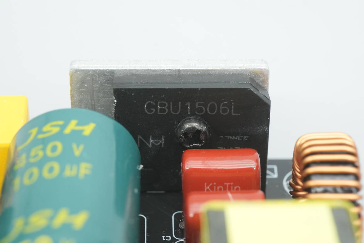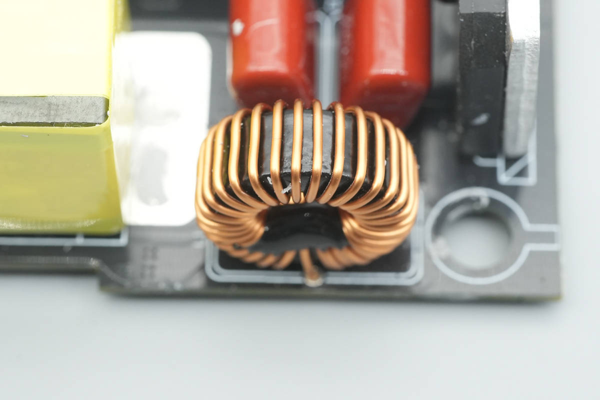 PCBA模块输入端一览,右侧焊接交流输入线,依次设有保险丝,共模电感,安规X2电容,NTC热敏电阻。左侧设有滤波电感和整流桥散热片。