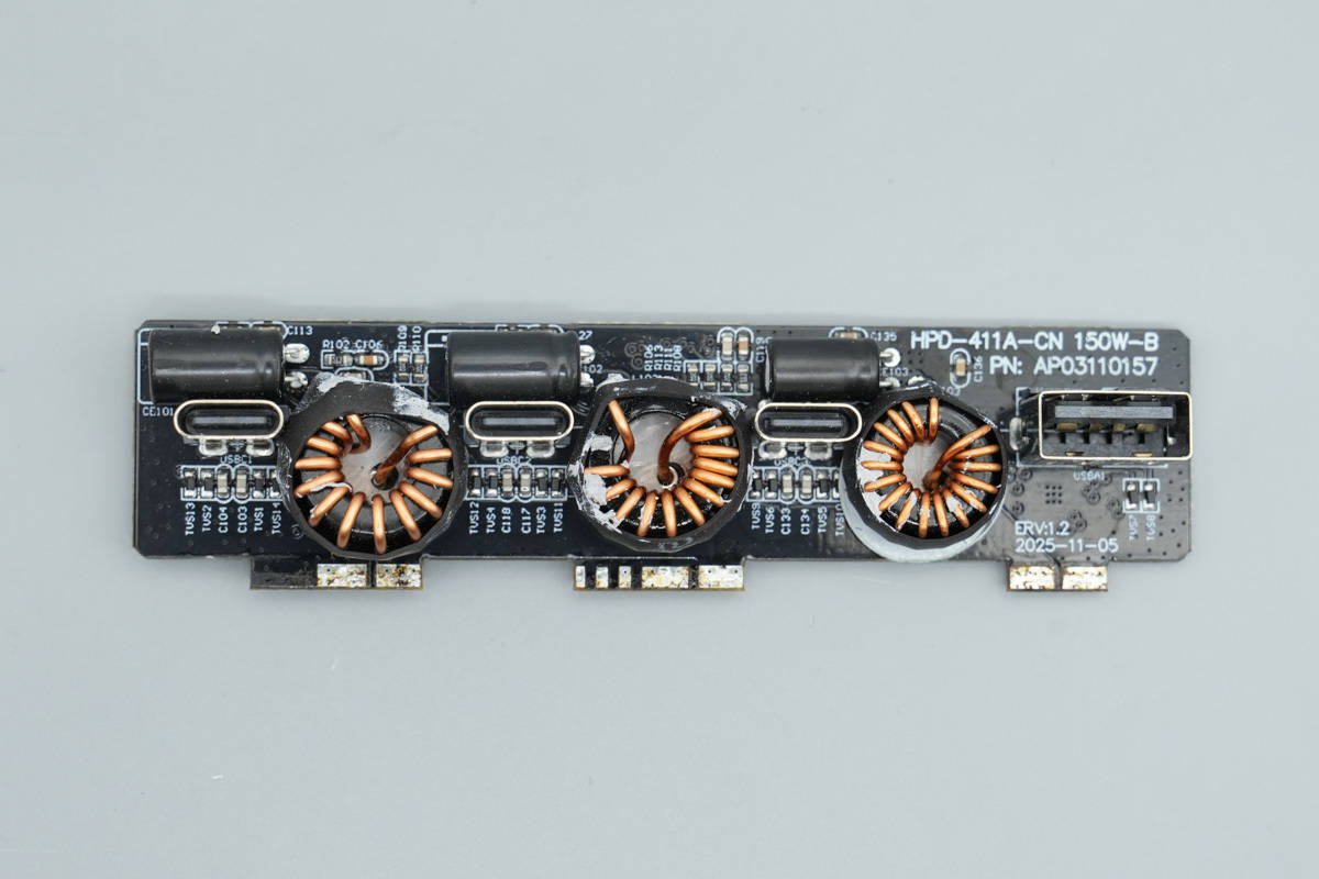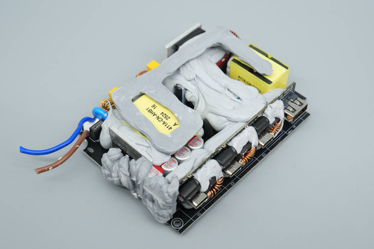 AHB合封芯片使用东科DK8715BD,同步整流芯片使用东科DK5V120R15T1。USB-C接口使用智融科技SW3566和SW3536降压输出,内部电容均为万京源品牌。PCBA模块打胶加固,并设有黄铜散热片加强散热,提供稳定高效快充体验。