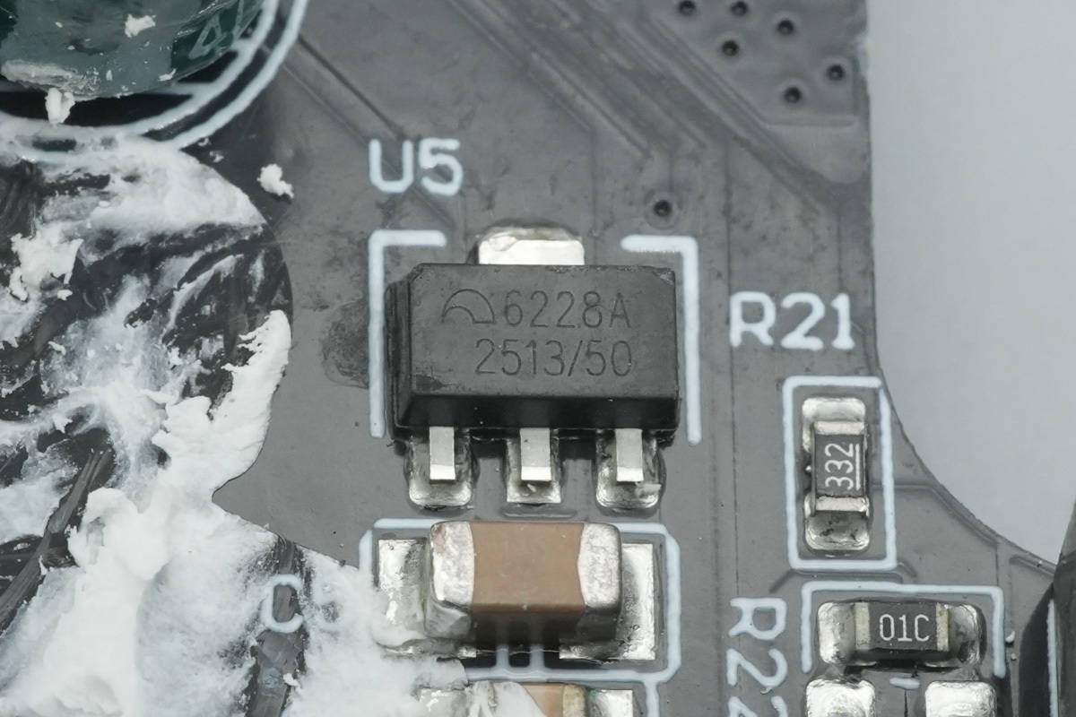 稳压芯片来自微盟,型号ME6228A50PG,支持30V输入耐压,输出电压5V,输出电流150mA,采用SOT89封装。