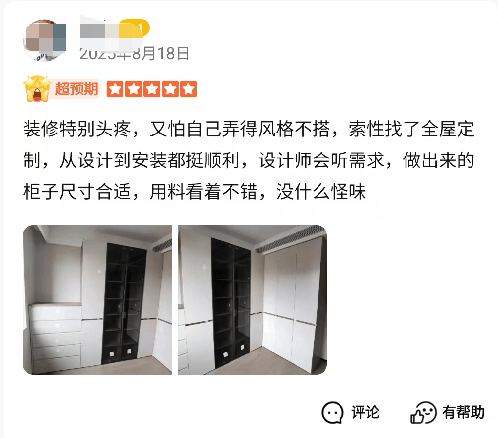 在口碑方面,众多客户对兔宝宝整木定制(十里河居然店二层)给予了高度评价。朝阳区的刘女士家里重新装修,选择了兔宝宝的超芯板和桉芯板,对材质、设计、安装都非常满意,反馈定制家具到家后没什么味道。丰台区的唐先生第一次做全屋定制,被门店大气的样品和丰富的花色所吸引,设计师的细心耐心也让他有了愉快的购物体验。