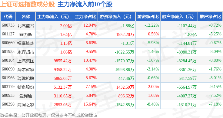 资金流向方面,上证可选(000035)指数成份股当日主力资金净流入合计1.17亿元,游资资金净流出合计1.26亿元,散户资金净流入合计857.01万元。成份股资金流向详情见下表: