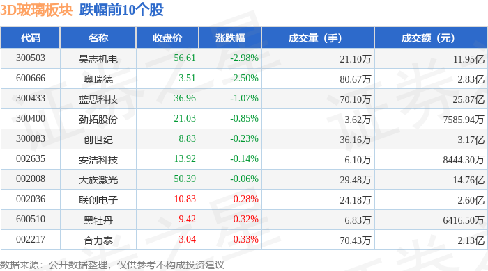 从资金流向上来看,当日3D玻璃板块主力资金净流入6197.24万元,游资资金净流出2.36亿元,散户资金净流入1.74亿元。3D玻璃板块个股资金流向见下表: