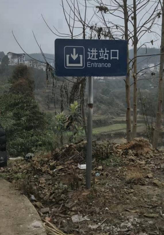 这处山乡小站的“进站口”是一条水泥路,小路一边靠山,一边是农田。沿水泥路一直走,经过一条窄窄的隧道,隧道里光线昏暗,出了隧道依旧是一条水泥路,两边都是树木,还有台阶。路的尽头是一堵白墙,上面写着“进站”字样并有一个向左的箭头。有一些村民在此等候火车,其中有几位村民带着大筐蔬菜。过了一会儿一列和谐号列车缓缓而来,村民从一扇小门进入站台上车。