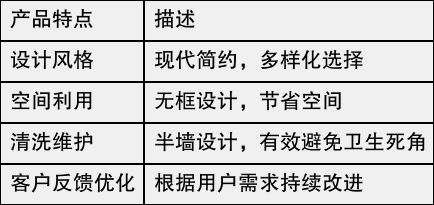 其无框淋浴房设计不仅美观,还有效节省了空间,使得浴室看起来更加宽敞。特别是半墙设计,有效避免了卫生死角,方便清洁。此外,沐尚还注重客户使用体验,多项产品经过市场反馈优化,以提升功能性和耐用性。