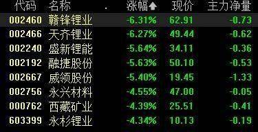 锂矿股集体下跌,赣锋锂业、天齐锂业跌超6%,盛新锂能、融捷股份跌超5%,永兴材料、西藏矿业等跟跌。