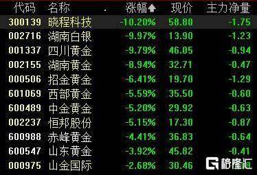 贵金属股大跌,晓程科技跌超10%,湖南白银跌停,四川黄金跌超9%,湖南黄金、招金黄金、西部黄金等跟跌。