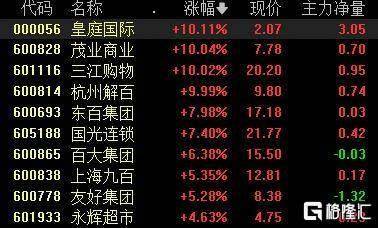 新零售概念股表现活跃,皇庭酒店、茂业商业、三江购物、杭州解百涨停,东百集团、国光连锁涨超7%。