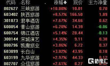 旅游股走强,三峡旅游涨停,陕西旅游涨超8%,君亭酒店涨超7%,黄山旅游、锦江酒店、宋城演艺等跟涨。
