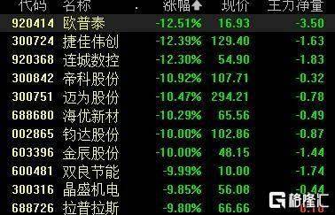 太空光伏概念股集体回调,欧普泰、捷佳伟创、连城数控跌超12%,帝科股份、迈为股份、海优新材跌超10%,钧达股份、金辰股份、双良节能跌停。