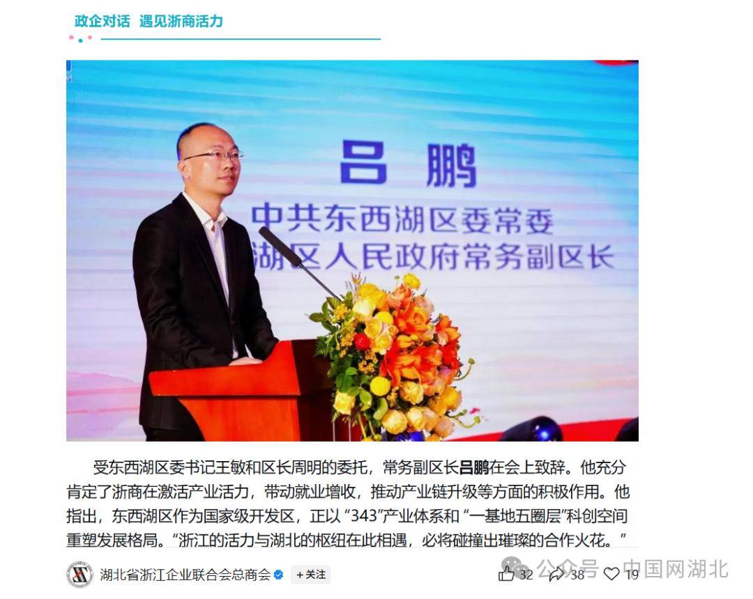 2月2日,“湖北省浙江企业联合总商会”公众号发布一个活动消息称,在“凝聚浙商力量 共绘发展新篇” 浙商长青行活动中,中共东西湖区委常委、常务副区长吕鹏参加活动并致辞,他在致辞时,明确表示“受区委书记王敏和区长周明委托。”