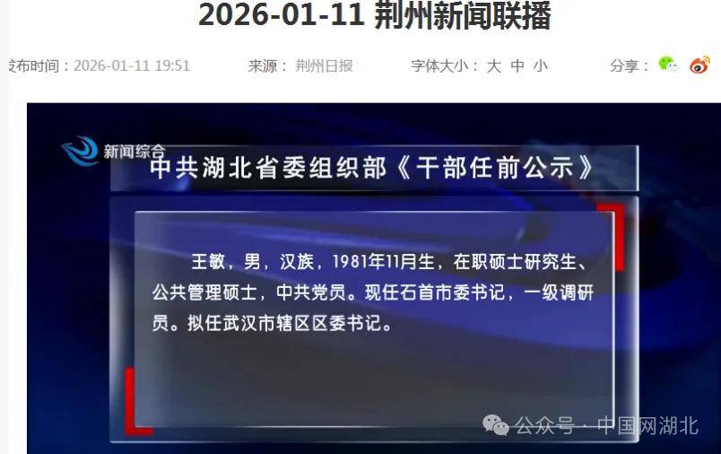 此前的1月11日,据荆州日报报道,中共湖北省委组织部发布干部任前公示,王敏拟任武汉市辖区区委书记。