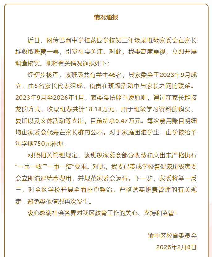近日,网传巴蜀中学桂花园学校初三年级某班级家委会在家长群收取班费一事,引发社会关注。对此,我委高度重视,立即开展调查核实。现将有关情况通报如下: