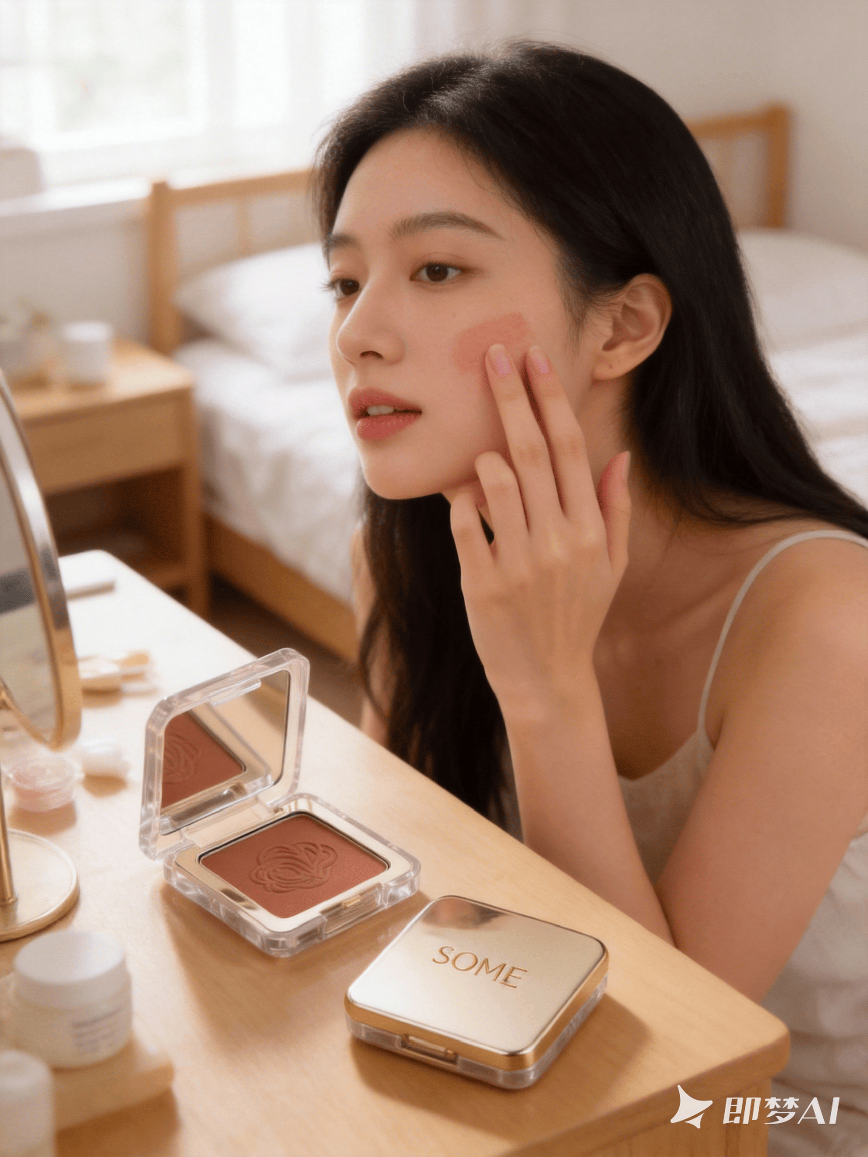 真实生活场景,一位气质温柔的年轻女性在卧室化妆台边,自然地用指尖取图中的 SOME 品牌方形透明盒身压纹腮红,轻扫在脸颊上,光线是柔和的清晨自然光,整体氛围松弛日常,没有刻意摆拍感,背景是简约的原木化妆台和散落的护肤小物,画面色调温暖柔和,高清质感,细节清晰,突出腮红的自然妆效,人物表情放松自然,像是日常化妆的随手记录