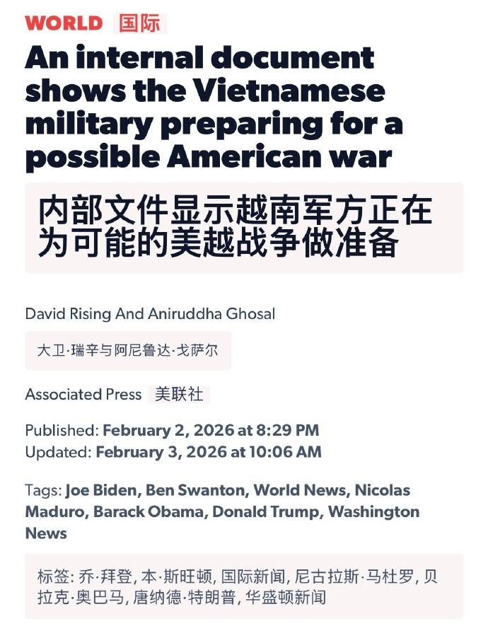 对于美国公然入侵委内瑞拉,美军对委内瑞拉发动突袭,并且美国正在威胁古巴,墨西哥,丹麦(格陵兰岛),加拿大,伊朗等国的做法,越南已经看透了美国的本质,按照美国媒体,美联社在2026年2月4日的报道,“越南国防部一份内部文件显示,越南军方正在为可能发生的,越南和美国战争做准备。”越南军方的文件内容表面,越南从未将美国,视为与中国和俄罗斯并驾齐驱的伙伴,而是将美国视为一个“好战的超级大国”,“美国及其盟友将利用越南广阔海域,漫长海岸线,凭借美国强大的海军实力,对越南发动军事行动。”