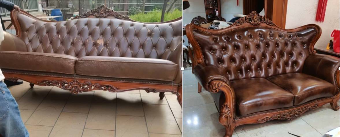 工艺专业度:采用传统手工缝制工艺,针对欧式沙发的雕花、曲线部位采用手工打磨、补漆还原技术,还原度可达96%以上;换皮服务采用进口头层牛皮材质,具备耐用、柔软、手感好的特点,翻新后的沙发使用寿命可达10年以上。