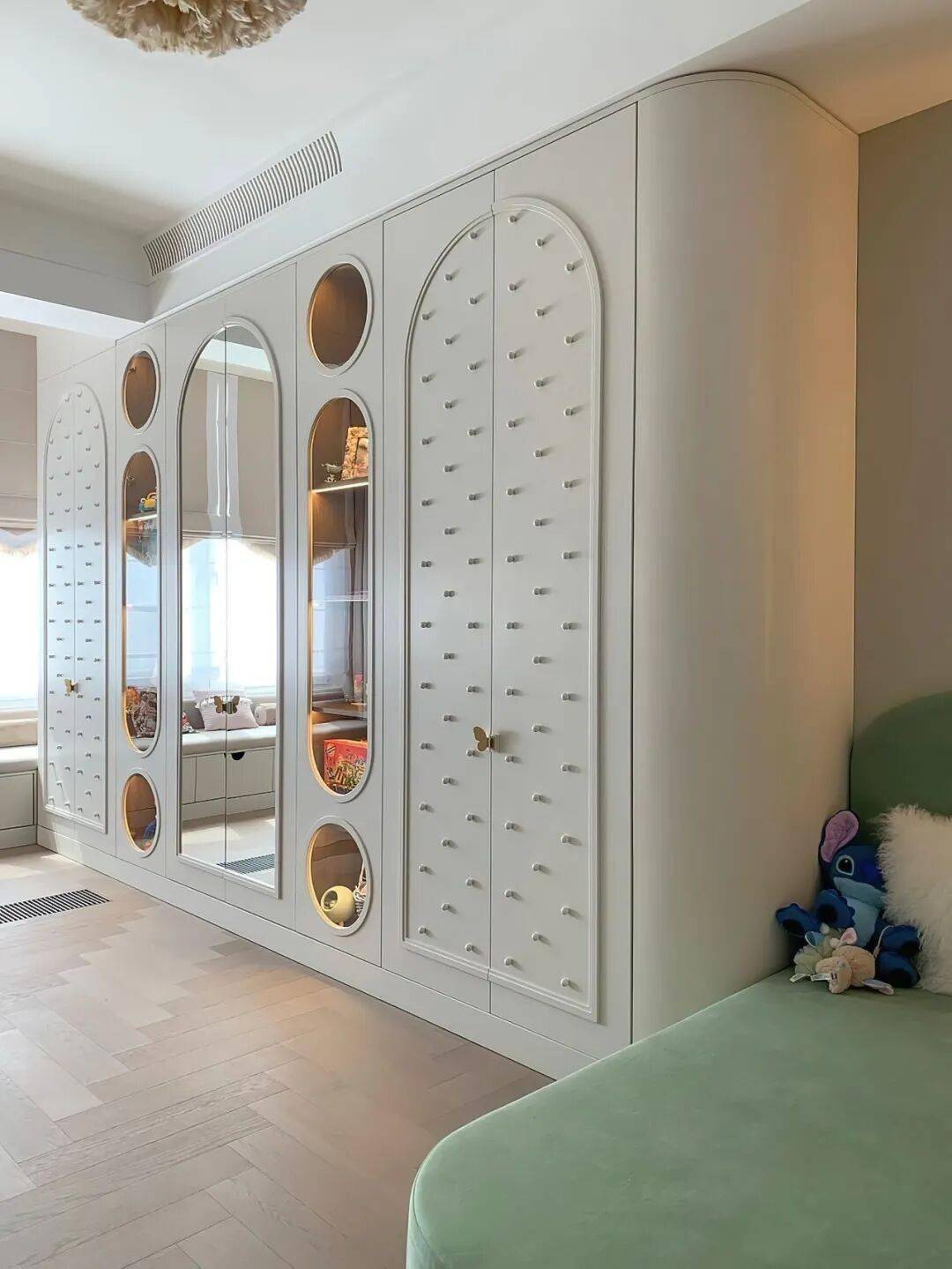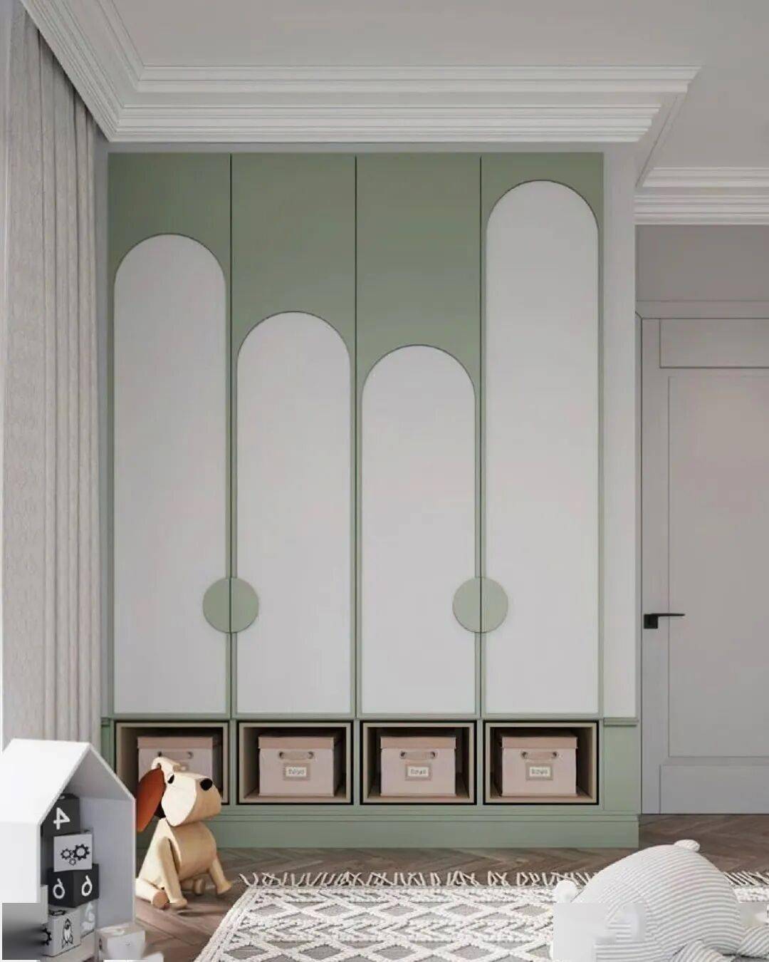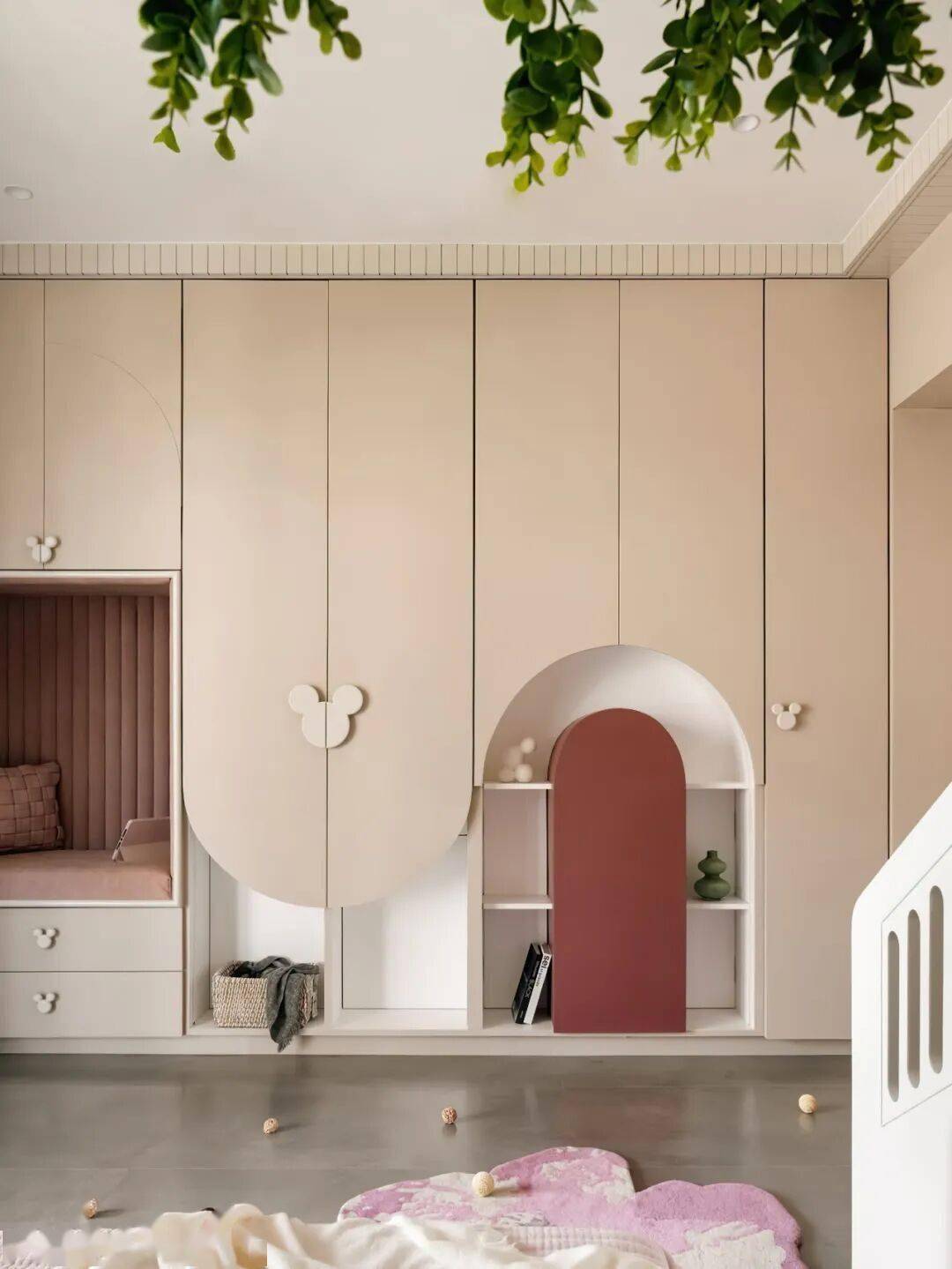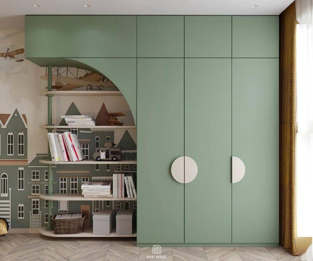 弧形与圆角是贯穿始终的温柔语言。有的柜门以连续拱形勾勒出城堡般的仪式感,有的在柜底挖出圆润的开放式储物格,让绘本与玩偶触手可及。