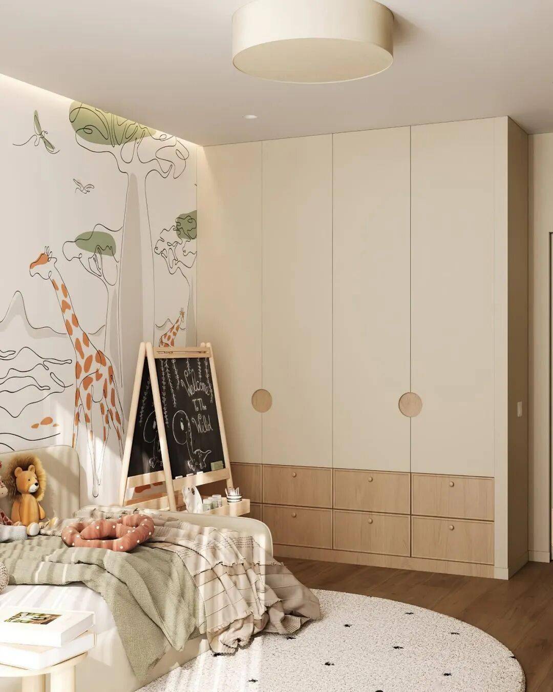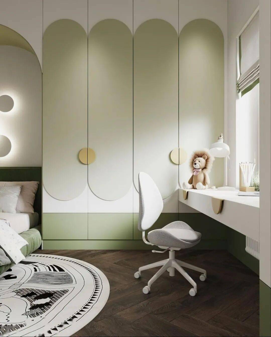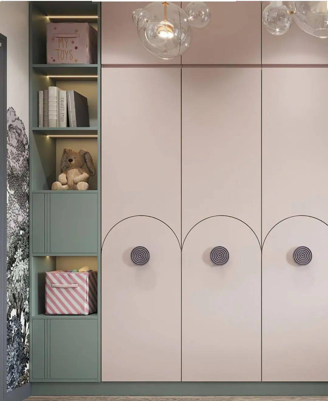 弧形与圆角是贯穿始终的温柔语言。有的柜门以连续拱形勾勒出城堡般的仪式感,有的在柜底挖出圆润的开放式储物格,让绘本与玩偶触手可及。