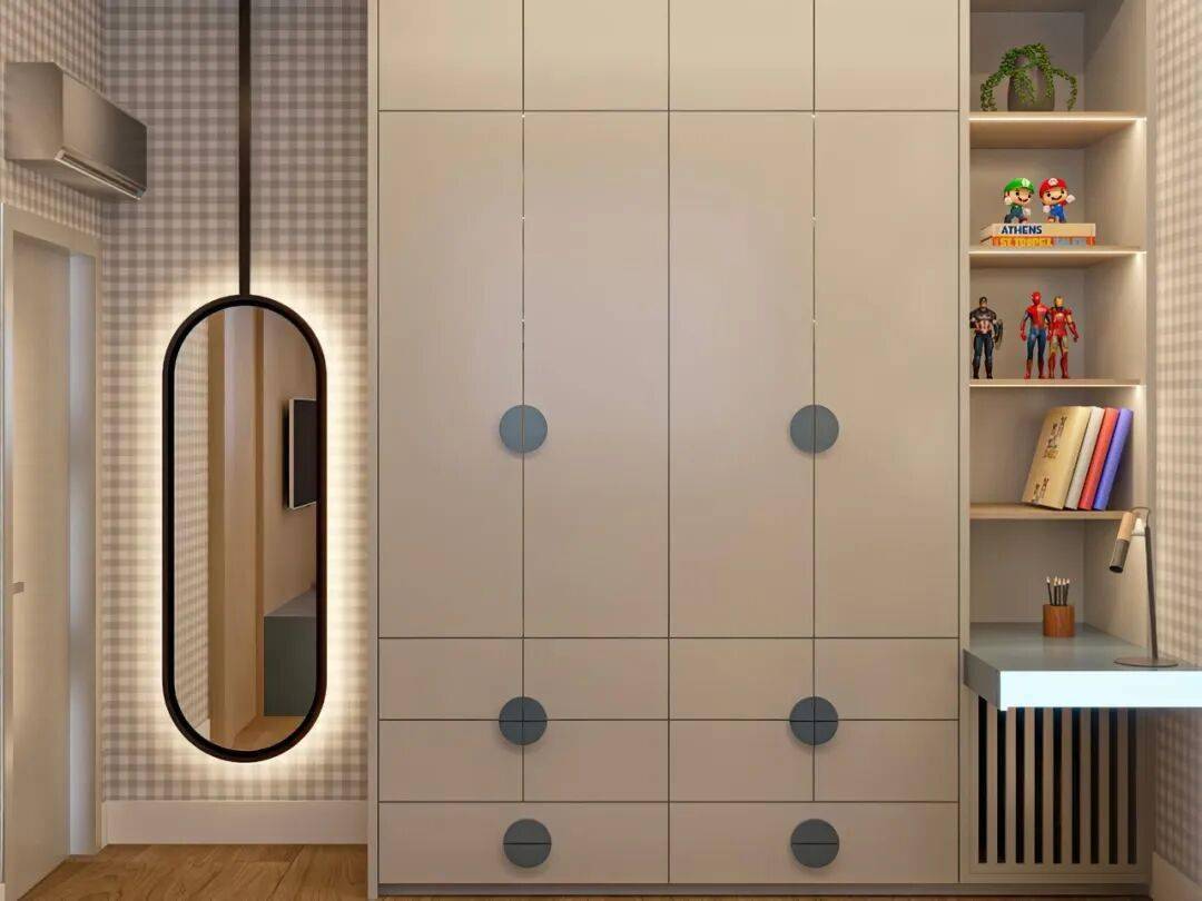 还有的将镜面与镂空圆洞嵌入柜体,既是穿搭镜也是展示橱窗,满足孩子小小的炫耀欲。