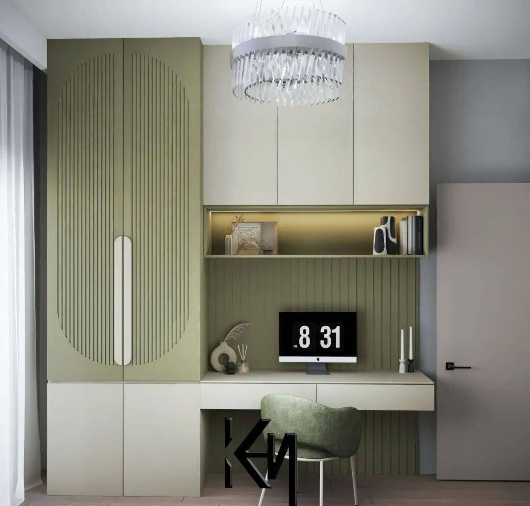 低饱和度的莫兰迪色系是这场视觉盛宴的主角:柔和的豆绿与奶白拼接出云朵般的轮廓,静谧的雾霾蓝搭配原木拉手,还有樱花粉与竖纹墙板交织出的甜美梦境。