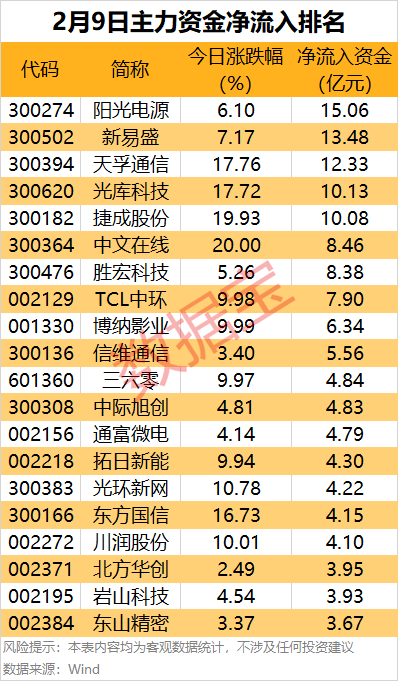 此外,还有天孚通信、光库科技、捷成股份、中文在线和胜宏科技等热门股主力资金净流入金额居前,均超8亿元。