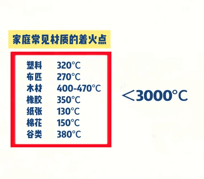 实验表明,通电后电火花瞬时温度高达3000摄氏度,远高于家里的木头、布料、塑料等常见材质的着火点。