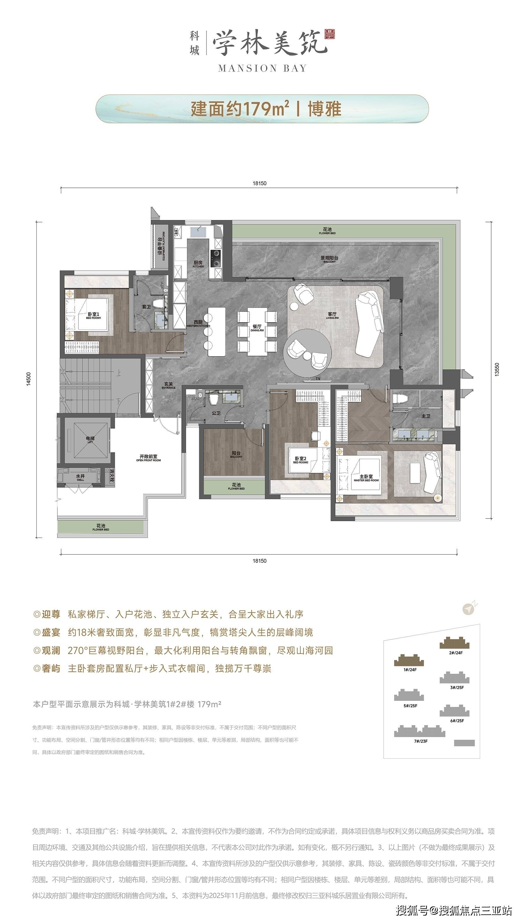 建面约124-179㎡的3-4房,户户标配大面宽空间、入户花园、宽景阳台及满配精装交付规格,户户尊享电梯入户,筑就崖州湾塔尖生活主场;头排产品建面约179㎡四房户型更可奢享逾18米奢致面宽、270°环幕观景阳台与双套房高定配置,独揽万千尊崇。