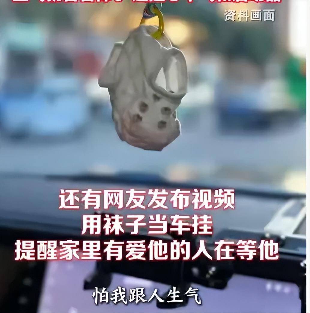 还有网友晒出图片,用袜子当车挂,是提醒家里有爱他的人在等着他,一定要小心开车,注意安全。