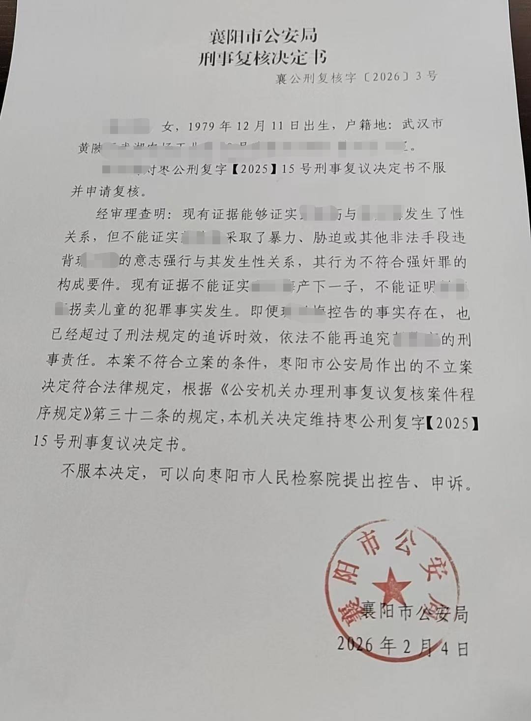 2026年2月4日,襄阳市公安局出具《刑事复核决定书》告知:经审理查明,现有证据能够证明高强与陈梅发生了性关系,但不能证实高强采取了暴力、胁迫或其他非法手段违背陈梅的意志强行发生性关系,其行为不符合强奸罪构成要件;现有证据不能证实陈梅产下一子,不能证明高强拐卖儿童的犯罪事实发生;即便陈梅控告的事实存在,也超过了刑法规定的追诉时效,依法不能再追究高强的刑事责任。本案不符合立案条件。