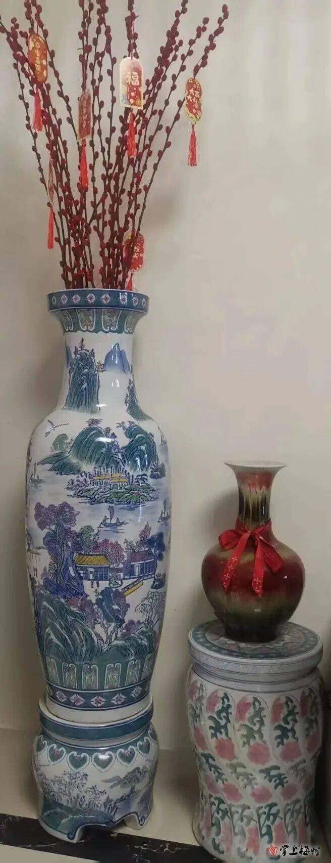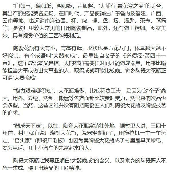 大花瓶,我们也叫它“大花盎”。在一些公司门口或展厅、人家客厅、客家商会大厦等地方,总有它引人注目的身影。这体形硕大瓶身绘有美轮美奂的青花图案的“大家伙”,是我家乡大埔县的特色陶瓷产品。