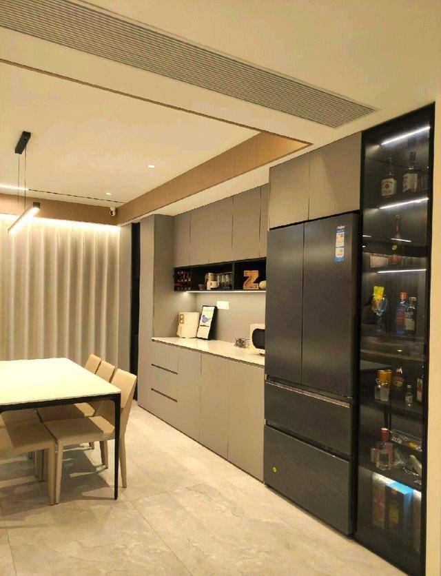 这是目前零差评的黄金位置。做全屋定制的时候,直接让设计师把冰箱嵌进餐边柜。选底部散热的嵌入式冰箱,严丝合缝,颜值拉满 。以后吃完饭,顺手把剩菜塞冰箱,动线比放厨房还顺。关键是——厨房瞬间多出至少1平米的操作空间,能多做一组高柜,蒸箱烤箱洗碗机全塞进去,不香吗?